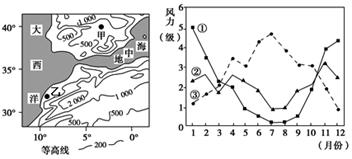 【小题1】由左图中经纬度及陆地轮廓可知,甲乙两地位于30°--40°之间欧洲西部的地中海气候区,夏季受副热带高气压带控制,风力较小;两者的冬季都受西风带的控制,盛行西风,由于甲西侧有山脉阻挡,风力较弱为②曲线;乙西侧为海洋,风力较大为①曲线;故选项D正确。