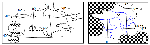 (3)试简述图中M、N两河的主要补给类型,并分析由此而造成的两河水文特征的差异。(10分)
