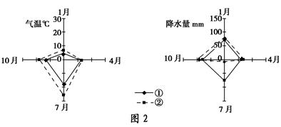 2、单选题 图1是2013年5月15日14:00欧洲部分地区海平面等压线分布图,图2是①、②两种气候类型的气温与降水量图。读图回答小题。(双选) |