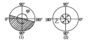 本题解析::本题考查地球地图。根据图(1)阴影部分表示东半球,判断图示的自转方向为逆时针,故甲的地理位置(45°N,135°W);根据图(2)极地东风带的风向,判断为北半球,故乙地的地理位置(22.5°N,180°);故甲在乙的东北方向。