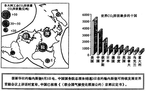 3、综合题 读图七“世界各大洲工业CO2排放量及世界CO2排放量最多的十国柱状图”及有关资料,分析回答:(共10分)