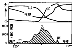 1、单选题 图下部为某岛屿沿回归线的地形剖面图,上部是该区相关地理事物沿线变化图,回答问题。