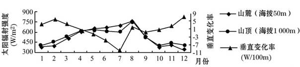 5、单选题 读“江淮地区某山山麓与山顶太阳辐射强度及其垂直变化率折线图”,回答下列小题。