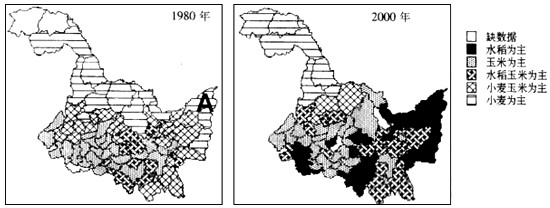 下图是1980年和2000年黑龙江省三大粮食作物分布示意图。