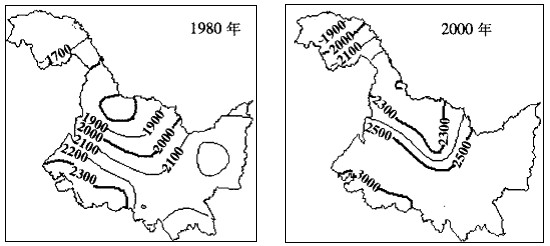 ? 下图是1980年和2000年黑龙江省积温(℃)等值线分布示意图。(积温:作物在生长发育时期,不仅要求一定的温度水平(温度的高低),而且还需要一定的热量总和,此热量总和通常是用该时期逐日气温的累积值表示,这个累积值就叫作积温,单位是度日。)