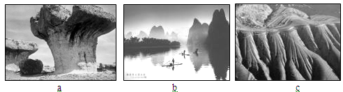 (4)下图中最有可能在E地拍摄的照片是 ,该地貌景观形成的主要地质作用是 。C景观的形成原因是 (3分)
