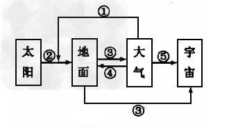 3、单选题 图中各箭头及其代表符号①、②、③、④、⑤表示太阳、地面、大气、宇宙空间之间的热力作用,其中包括太阳辐射、地面辐射、大气辐射、大气逆辐射、大气对太阳辐射的削弱作用(吸收、反射和散射)。读图回答1~2小题。