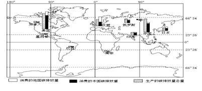 材料一:2009年世界部分国家生产和消费碳排放量的数量分布图