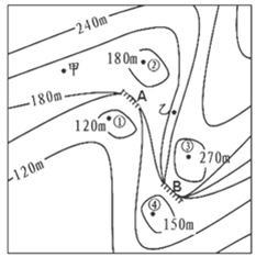 【小题1】洼地积水成湖。图中等高距为30米,按照等高线两侧海拔高度取值范围不同,可判断1地为海拔低于120米的洼地,2为海拔低于180米的洼地,两处均可积水成湖。3为海拔高于270米的高地,4为海拔低于150米的洼地,但因4地位于山脊上,不易积水成湖。故为瀑布提供水源的湖泊为2。B正确。