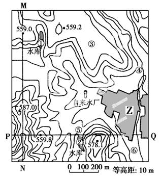4、综合题 下图是某地地形图,MN、PQ是地形剖面线。①、②是水库,为了Z村的发展,该地新建了一座自来水厂。读图完成下列各题。(10分)