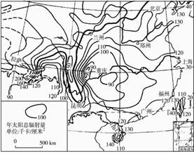 3、综合题 读“我国部分地区太阳总辐射量图”和我国某些城市的地理纬度与年平均日照时数表,分析完成下列问题。