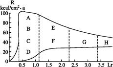 4、单选题  读“自然地带与水热条件关系图”,A~H表示不同的自然带,R为年辐射差额,即热量收入;Lr为干燥指数(多年平均蒸发量与降水量之比),指数越大,表示越干燥。据此完成小题。