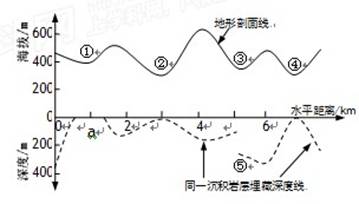 5、综合题 读某地地形剖面及其地下同一沉积岩层埋藏深度示意图,回答问题。(10分)