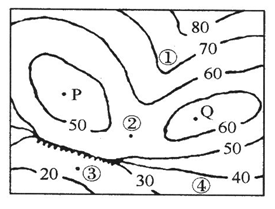 1.对图中各地地形的正确叙述是2.图中陡崖顶部的海拔高度可能为3.P、Q两地的相对高度 A.①为山脊 B.②为鞍部 C.③为陡崖 D.④为山谷 E.40m F.45m G.55m H.65m I.不少于10m G.不超过10m 可能为5m 不可能为15m