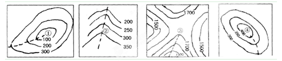 1.图中的数字表示地形的部位,下列选项中,地形部位名称排列与图序相符的是2.上图四幅地图中的虚线处,可能发育有河流的是