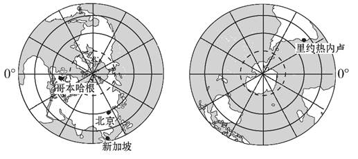 【小题2】从图中也不难看出哥本哈根的纬度位置最高,新加坡的纬度位置最低,根据所学的地球自转线速度大小与纬度位置高低的关系(纬度越高,线速度越小)可以判定,新加坡的线速度最大,哥本哈根的线速度最小。故选C。