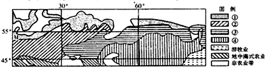 1.图中M地农业地域类型形成的主导区位因素是2.图中②代表的农业地域类型在我国主要分布在