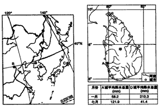 (2)说明甲国A、D两城市,分别在一月和七月出现降水差异的原因。?