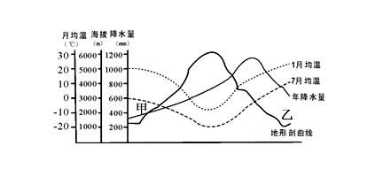 A.气温随纬度的分布规律 B.雪线随纬度的分布规律 C.海水蒸发量随纬度的分布规律 D.昼夜长短年变化幅度随纬度的分规律 参考答案: 本题解析: 本题难度:简单 4、综合题 读图文资料,回答问题。 参考答案:(1)地中海;亚热带常绿硬叶林 本题解析: 本题难度:一般 5、单选题 读下图,甲大陆①自然带与乙大陆⑤自然带类型相同,关于其成因的叙述,正确的是(? ) 参考答案:D 本题解析:从图甲中明显可以看出在北半球大陆东西两岸的自然带相同,这一定是温带落叶阔叶林带,从而可以判定①、②、③分别对应的自然带是温带荒漠带、温带草原带和温带落叶阔叶林带。又因为①、⑤两个自然带相同,结合图中的信息可以判定④也是温带落叶阔叶林带,图中的山脉为安第斯山的可能性极大。图中①自然带的形成是因为深居内陆、气候干旱而形成的;而④的形成是因为其地处安第斯山的东侧,盛行西风的背风坡。故选D 本题难度:一般 |