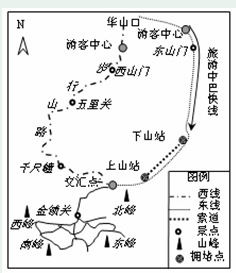 “自古华山一条道”,随着人们出游率的增高,“华山天下险”逐渐被“华山天下堵”所替代,如何认识与解决华山旅游拥堵问题引人关注。下图为华山东、西进山线路示意图,读下图完成下列问题。