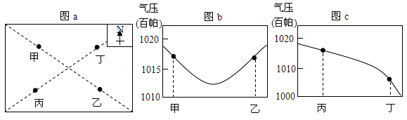 2、单选题 下图中图a为北半球某区域图,图b示意沿甲乙线的气压变化,图c示意沿丙丁线的气压变化。据此回答下列各题。