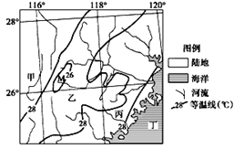 【小题1】根据图中陆地上等温线分布规律可知,乙地气温低于28°C,甲、丙气温高于28°C;根据图中气温数值可知此时为夏季,海洋升温速度较慢,气温较同纬度陆地低,因此丁地气温较低。