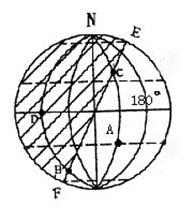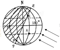 (4)根据赤道上全年昼夜平分,日出6时,日落18时,结合地球自转的方向,晨昏线EF是由昼半球进入夜半球,可知EF是晨线(日出),所以晨线与赤道的交点所在的经线为6使,根据上图每两条经线相差30°,即相差2小时(15°/小时),东早西晚即东加西减,所以可算出A点的地方时为8点;180°经线的地方时为10点,北京时间即为120°E地方时,两地相差60°即相差4小时,所以北京时间为10-4=6点。