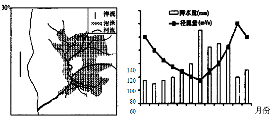 4、单选题 图为某地区某水系分布图和M地月平均径流量曲线、降水量柱状示意图,读图回答下列问题。