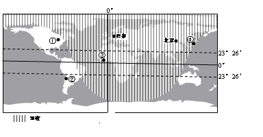 小题2:图中②大约在南半球700W附近④在日本岛大约在北半球1350E附近,②位于④的东南方,比较两地的方向要使两地在经度1800范围内进行,A错;。③位于赤道北侧,00经线附近 在北半球、东半球,B正确;图中阴影是默认,④在晨线附近;图中③地位于低纬,①②④位于中纬度地区,D错。