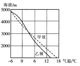 【小题2】该山位于北半球,南坡为阳坡,基带温度高,所以甲为南坡;北坡为阴坡,乙为北坡;南坡气温高,蒸发量大,湿度小于北坡,排除A、B项;3000m以上甲坡随高度气温变化慢,差异小,乙坡气温随高度变化快,差异大,所以选D项。
