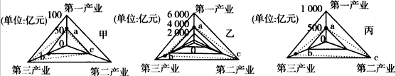 5、单选题 ? 下图中甲、乙、丙代表我国三省区2005年的国民生产总值及其构成,a、b、c分别为三大产业的产值,完成1—2题。