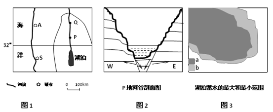 5、综合题 图1为某区域示意图,图2反映图1中的P地河谷剖面,图3反映图1对应的湖泊情况。回答下列问题。(10分)
