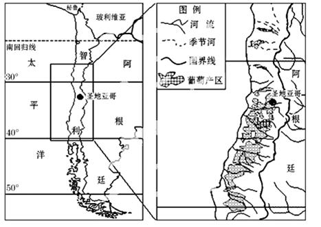 智利地形分为东、中、西三部分,中部的陷落谷地大多冲积物深厚。智利属于中等发展水平国家,拥有稳定的金融市场、政治经济体系和健全的法律制度。国内能源缺乏,电价是周边国家的两倍,政府主张兼顾能源需求和环境保护,优先发展清洁能源。下图是智利地理位置及葡萄主要产区分布示意图。