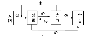 3、单选题 下图中各箭头及其代表符号①②③④⑤表示太阳、地面、大气、宇宙空间之间的热力作用,其中包括太阳辐射、地面辐射、大气辐射、大气逆辐射、削弱作用(吸收、反射和散射),回答下列各题。