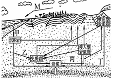 2、单选题 读图 “地壳物质循环示意图”,关于岩石圈地壳物质循环各环节的正确表述是A.甲——重熔再生B.乙——变质作用C.丙——沉积作用D.丁——冷却凝固