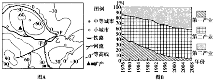 3、综合题 ? 图A是“我国东部沿海某地区城市分布图”,图B是“该地区1976年—2008年产业结构变化图”。读图回答下列问题。