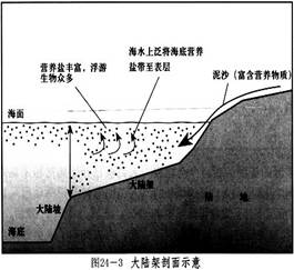 本题解析:理解大陆架渔业资源丰富的原因:①阳光集中,生物光合作用强;②入海河流带来丰富的营养盐类,海水上泛将海底营养盐带至表层;③营养盐丰富,浮游生物众多,为渔类带来丰富饵类。