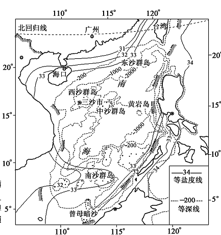 5、综合题  【海洋地理】2012年6月,国务院批准设立三沙市,管辖西沙、中沙、南沙群岛的260多个岛礁及200多万平方千米的海域。下图是南海海域8月份表层海水盐度分布图。读图回答下列问题。(10分)