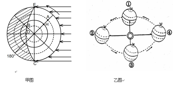 3、综合题 该图是 “以极地为中心的俯视光照图”(甲图)与“二分二至日地球的公转位置图”(乙图),甲图