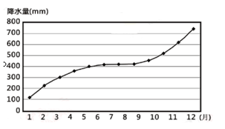 【小题1】正确理解题意,水循环最活跃的季节就是降水最多的季节,注意图中曲线是降水量“逐月累计”曲线。由图可知5、6、7、8月份,曲线基本呈水平直线,说明这四个月降水稀少,降水总量基本没有增加;该地位于北半球,此季节是夏季,即夏季高温少雨;图中10、11、12、1、2月,曲线斜率大,说明降水多,即冬季多雨,故选项D正确。