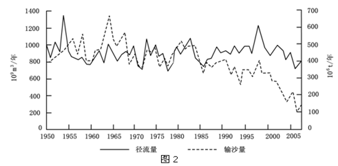 小题2:由于径流量变化不大,故水流的侵蚀力变化不大,而输沙量不断下降,故主要因素是含沙量减少,选项B。