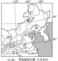 5、单选题 霜冻是指生长季节里因气温降到0℃或0℃以下而使植物受害的一种农业气象灾害。右图示意我国某区域多年平均初霜冻日期分布情况,读图完成问题。
