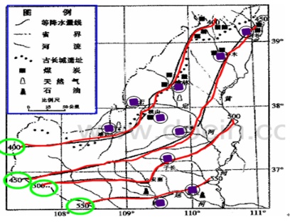 (1)描述陕北地区年降水量的分布特征;对比古长城两侧(地形区)的地势差异。(8分)?