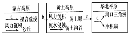 1、单选题 蒙古高原、黄土高原和华北平原在成因上具有一定的联系。下图中各字母表示不同的主导外力作用类型,读图回答1~2题。