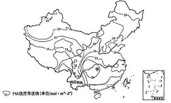 【小题2】影响PAR强度高低的因素很多,如纬度、地势、光照(日照时数)等,但主要因素是光照条件,日照时数越长,PAR强度值越大,反之越小。光照条件取决于天气状况,)乙地为横断山区,来自于印度洋的水汽从南部进入,一路形成降水。南部降水多雨日多,PAR值低。北部相反。