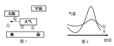 4、单选题 图7是大气受热过程示意图。图8是同一地点阴天和晴天的昼夜温度变化示意图。