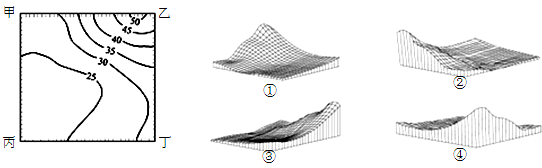 4、单选题 左图为某区域等高线地形图,读图判断从甲乙丙丁四个方向看到的景象,分别是( )