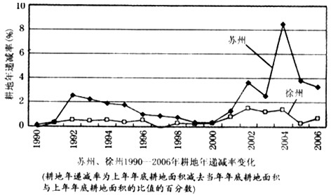 (2)读图比较1990年至2006年苏州和徐州耕地面积总体变化的共同性和差异性。