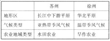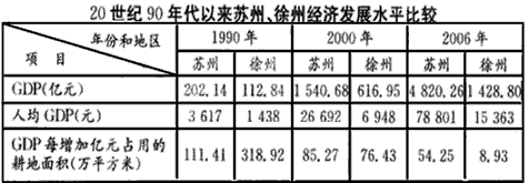 (3)读“20世纪90年代以来苏州、徐州经济发展水平比较”表,比较两地“GDP”和“GDP每增加亿元占用的耕地面积”变化的共同性和差异性。