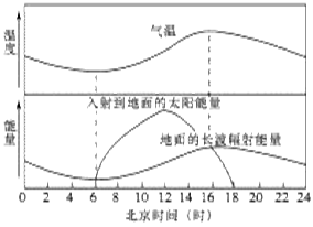 5、单选题 下图是我国某地一天内的气温日变化、地表的长波辐射能量和入射到地面的太阳能量日变化图,该日前后,开封的白昼在逐渐变短。读图回答下列问题。